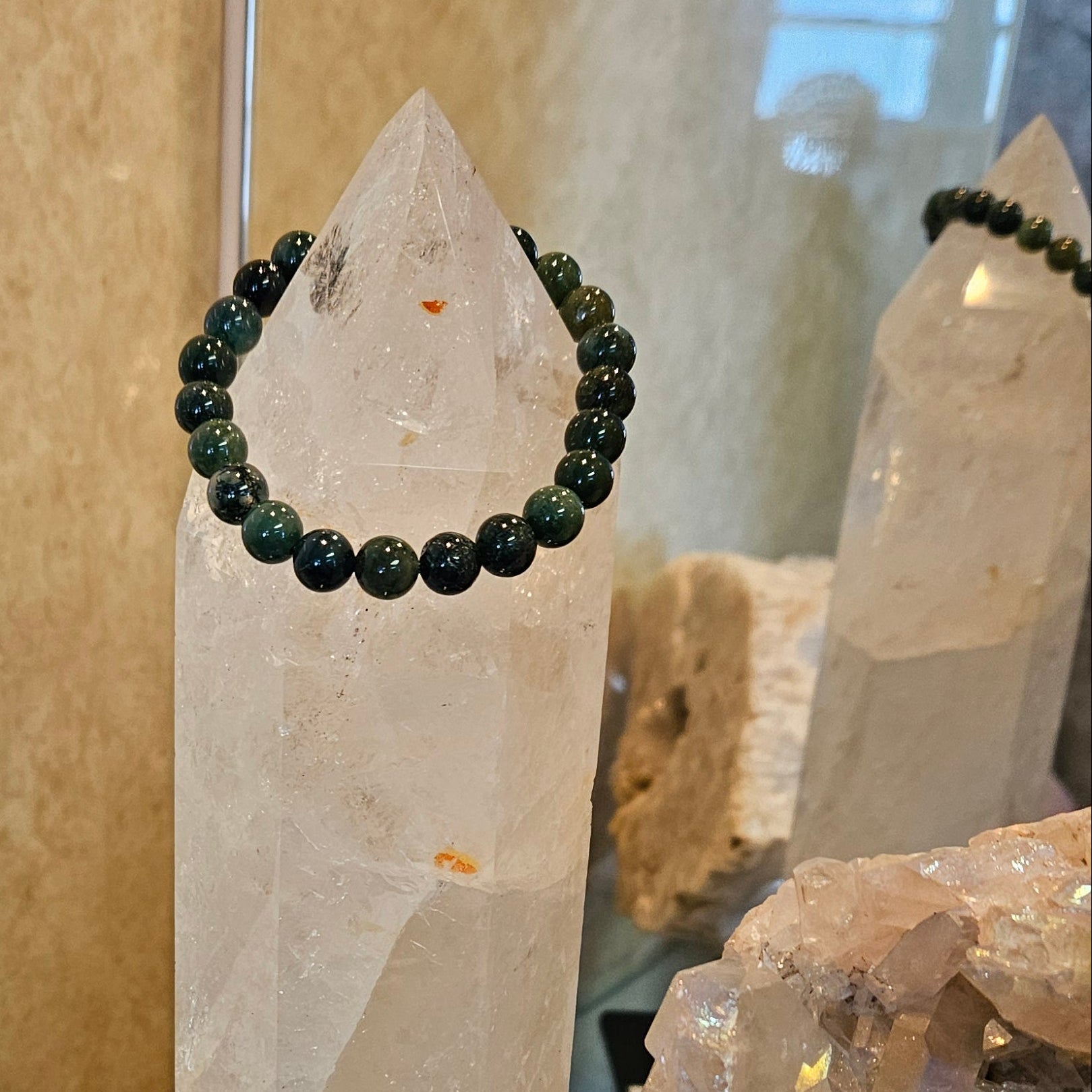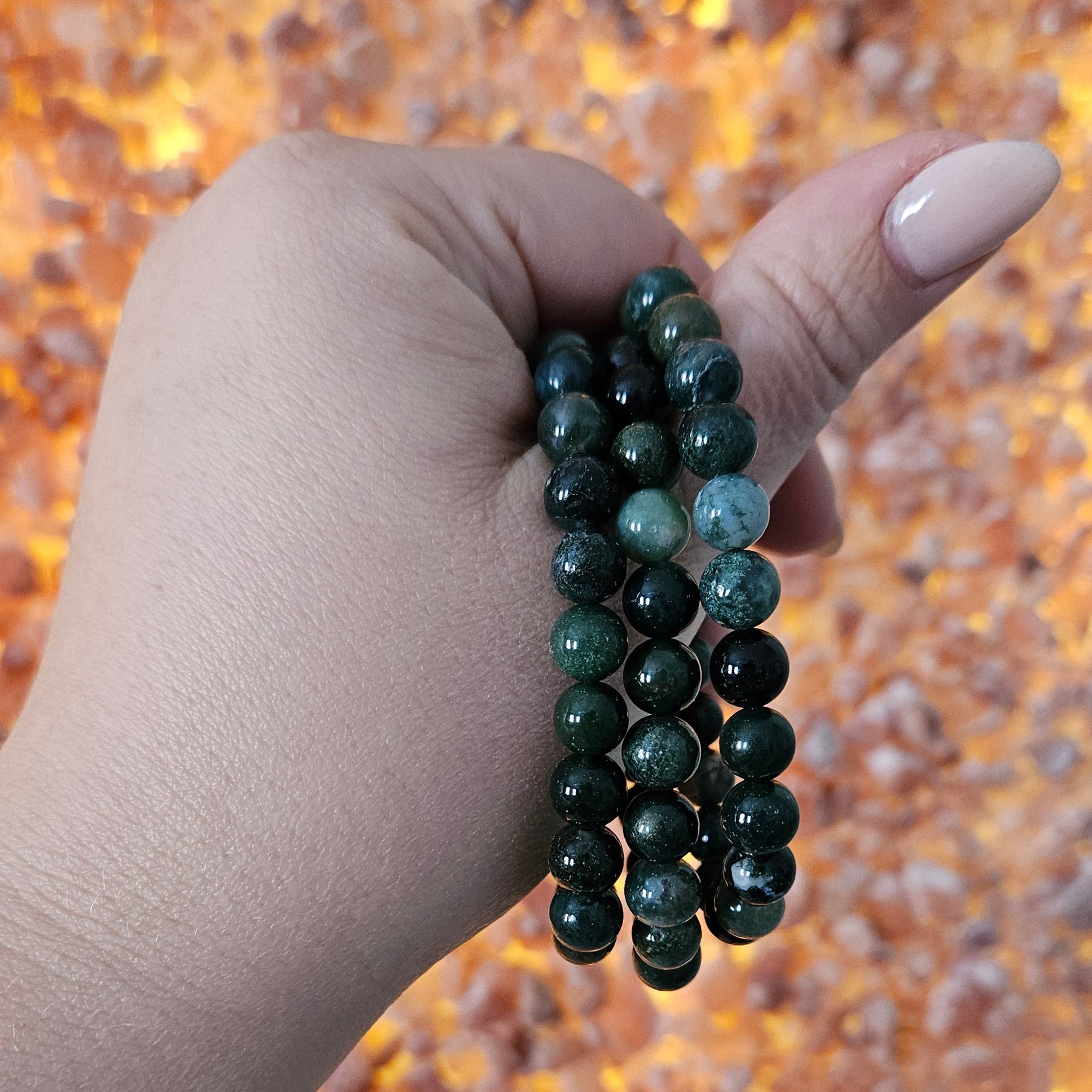 This stretch bead bracelet features earthy green and cream moss agate stones, celebrated for their grounding and stabilizing energy. Moss agate is believed to promote balance, growth, and a deeper connection to nature, making it a meaningful accessory for everyday wear. Smooth, polished beads are strung on a durable stretch cord for a comfortable, versatile fit. Wear alone or layer with other crystal bracelets for a stacked look.