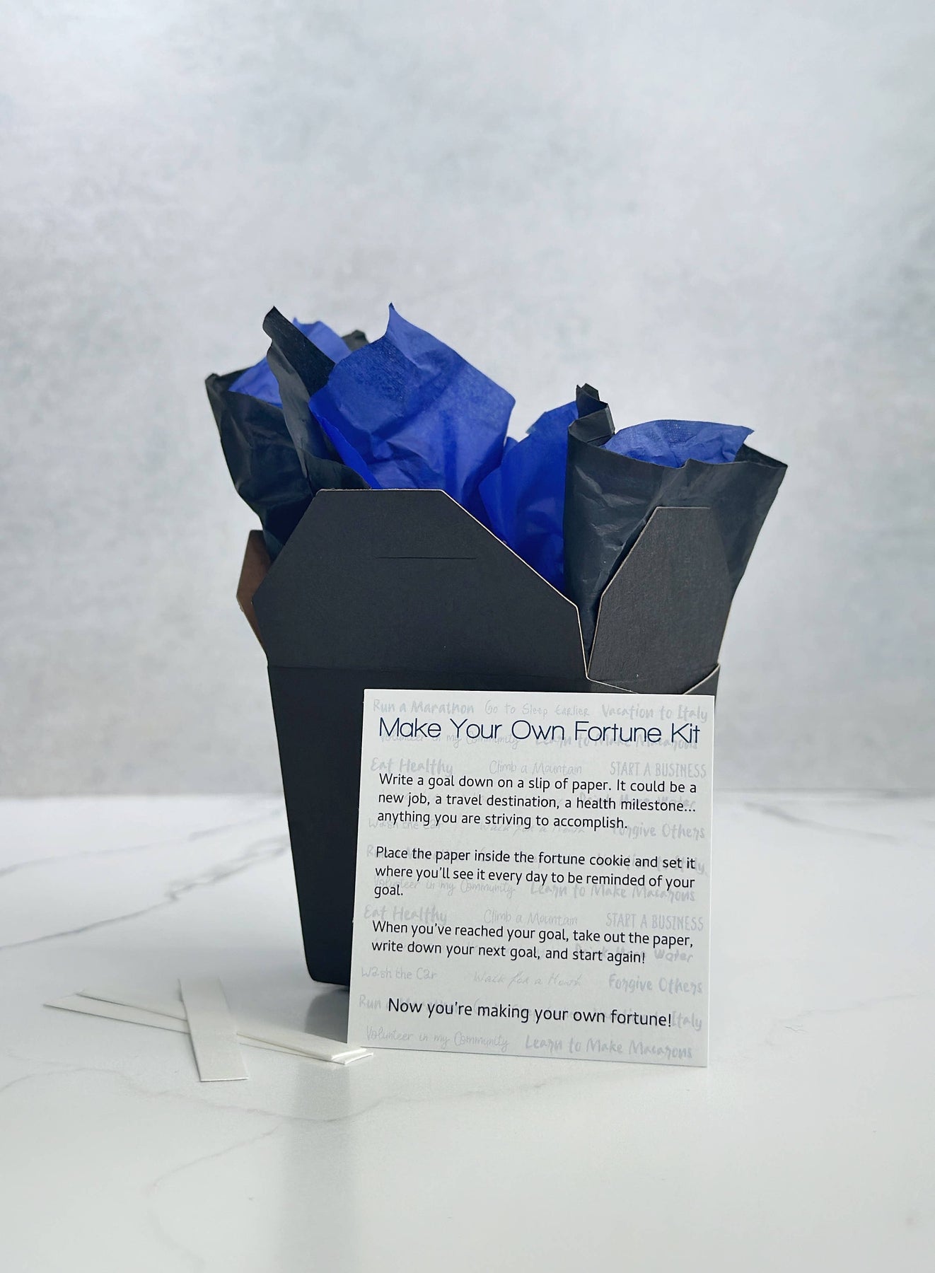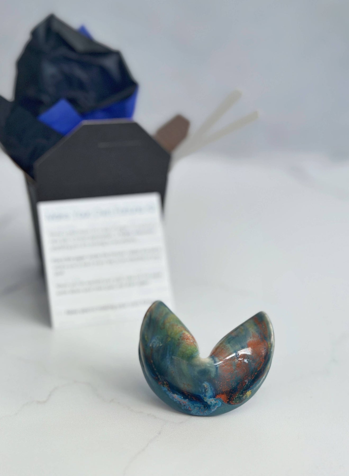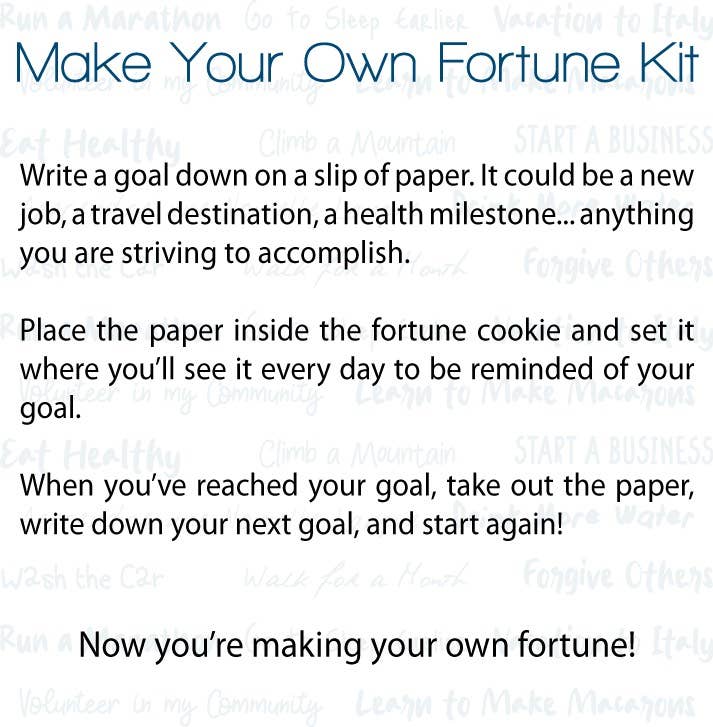 Designed to help with goal setting and manifestation, our Make Your Own Fortune kits have been a bestseller since they were introduced. Each kit comes packaged and ready for gift giving with a handcrafted ceramic fortune cookie, slips of paper, and a guidance card. How it works: Write down a goal or dream you wish to manifest on a slip of paper and place it inside the ceramic fortune cookie. Leave it out where you'll see it to be reminded daily. Once you have achieved your goal, create a new goal and keep going! Let this cookie be your daily reminder and motivator that you are creating your own fortune! Make Your Own Fortune kits make fantastic gifts and are a delightfully unique way to share some positivity and hope! We offer two box options to accommodate your display preferences. A black takeout box (2 3/4” x 2 1/4” x 2 1/2") or a black square gift box (3" x 3" x 2"). Both come with tissue paper. As they are individually handmade, each cookie may vary slightly.