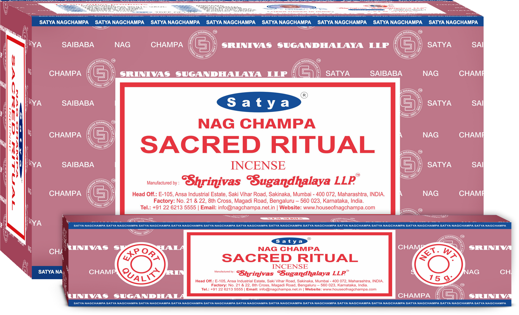 Satya Nag Champa - Sacred Ritual. 15g Box of 12. Message or call us for case and pallet information. Genuine Satya Brand incense from the company that brought you the original world famous Nag Champa