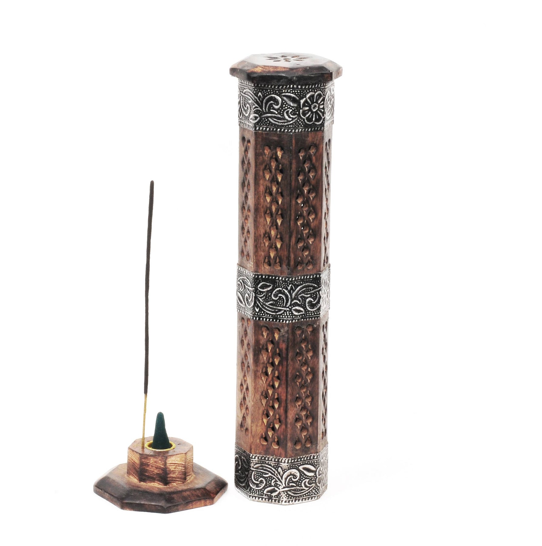 Tower Incense Burner: Mango Wood with White Metal / 10"